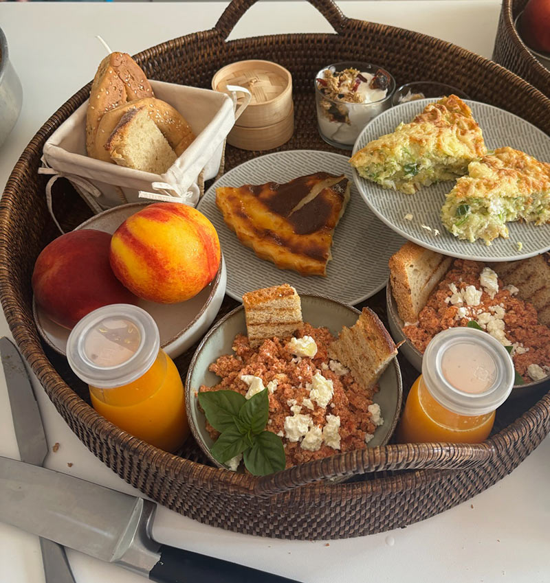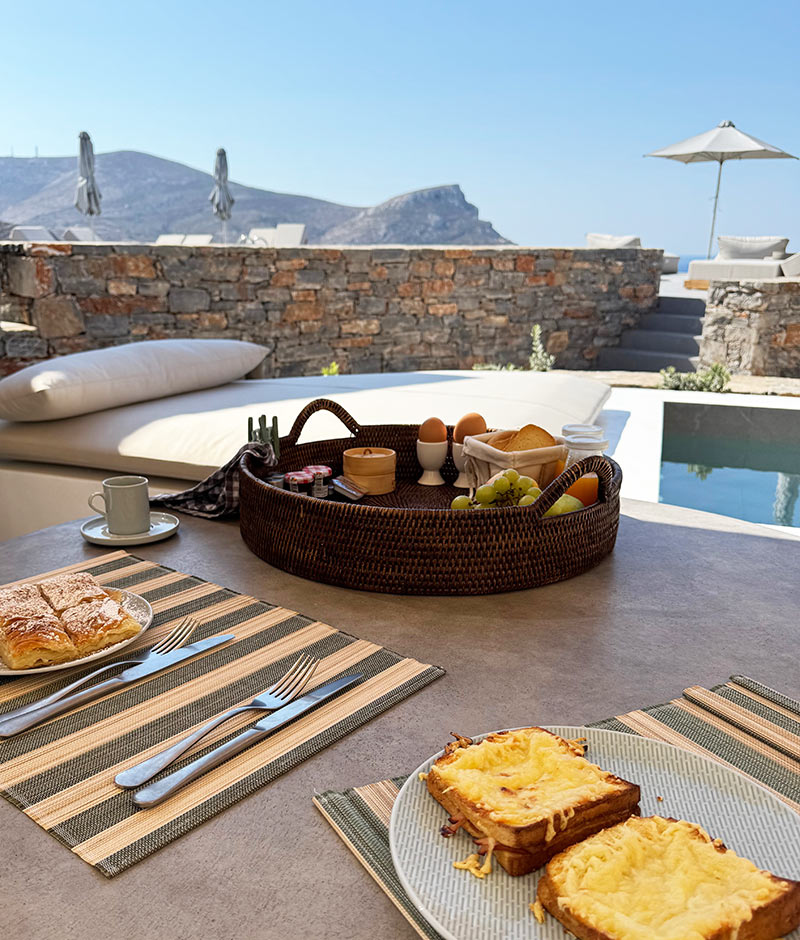 Each morning, breakfast is prepared by hand by Maria and the team and delivered to your terrace at the time you choose. There are no set schedules and no buffet, just a relaxed start to the day shaped around your own pace. Dishes change daily, guided by the season and what feels right that morning, and are meant to be enjoyed slowly, with the view, the breeze and the quiet stillness of the island. It’s enjoyed outdoors, at your own pace, with nothing else scheduled for the morning.