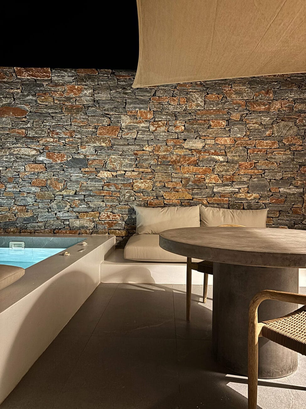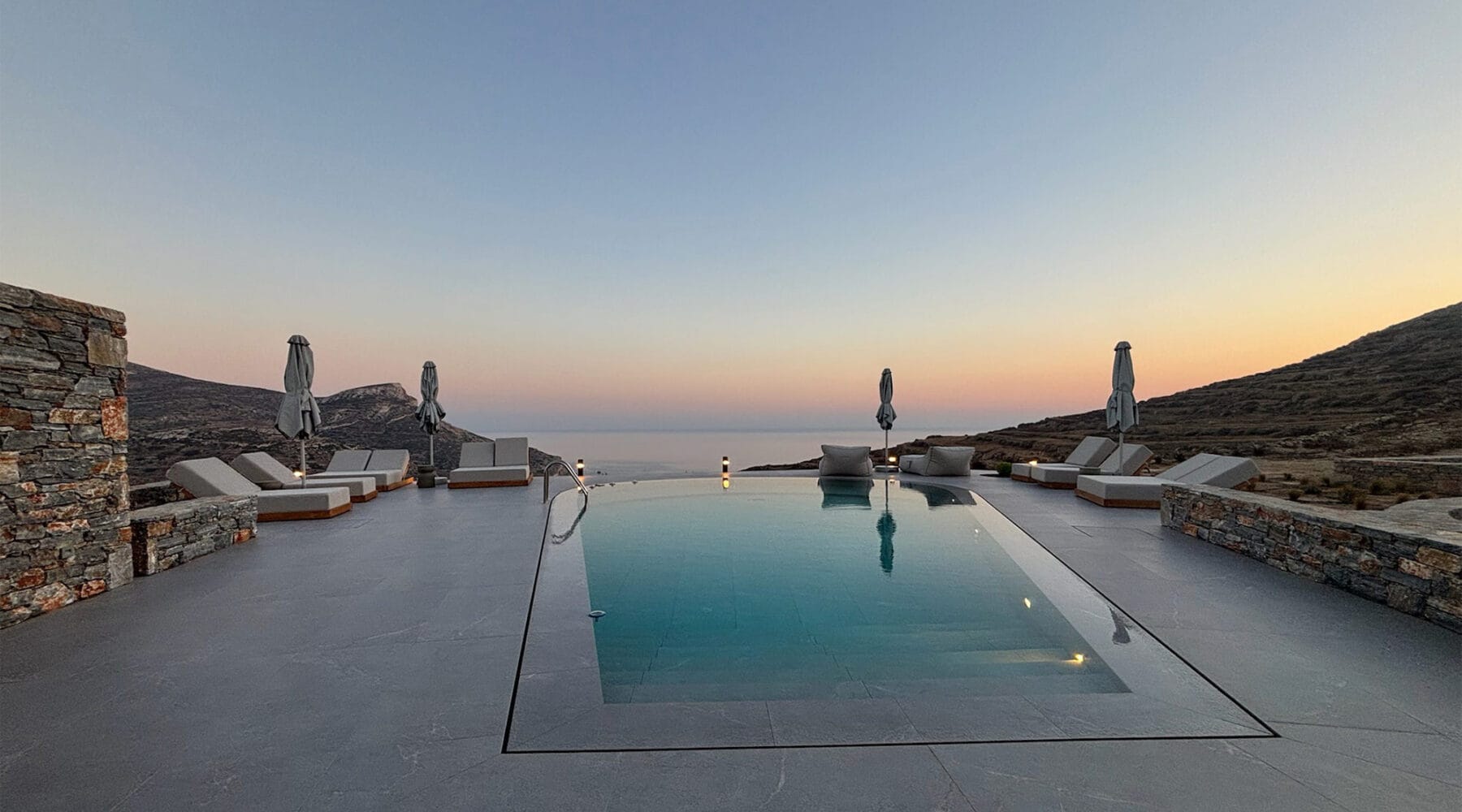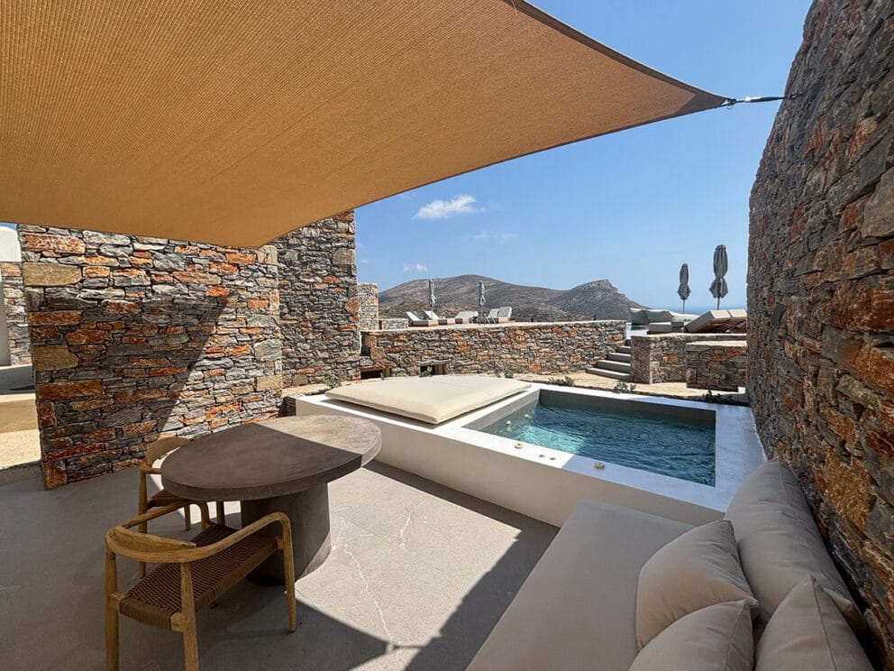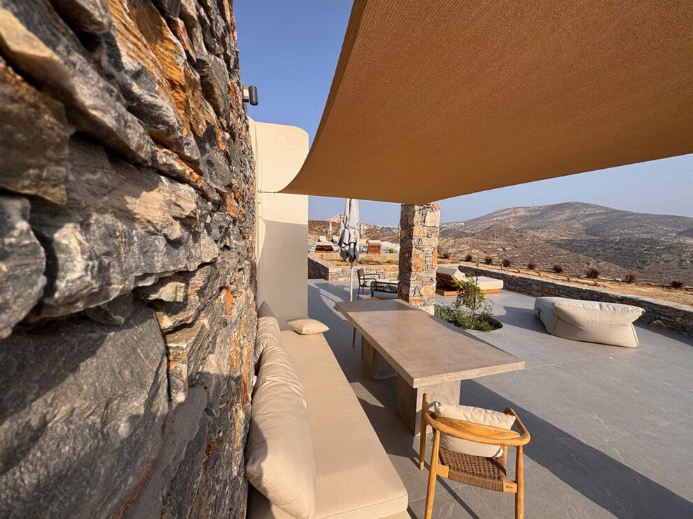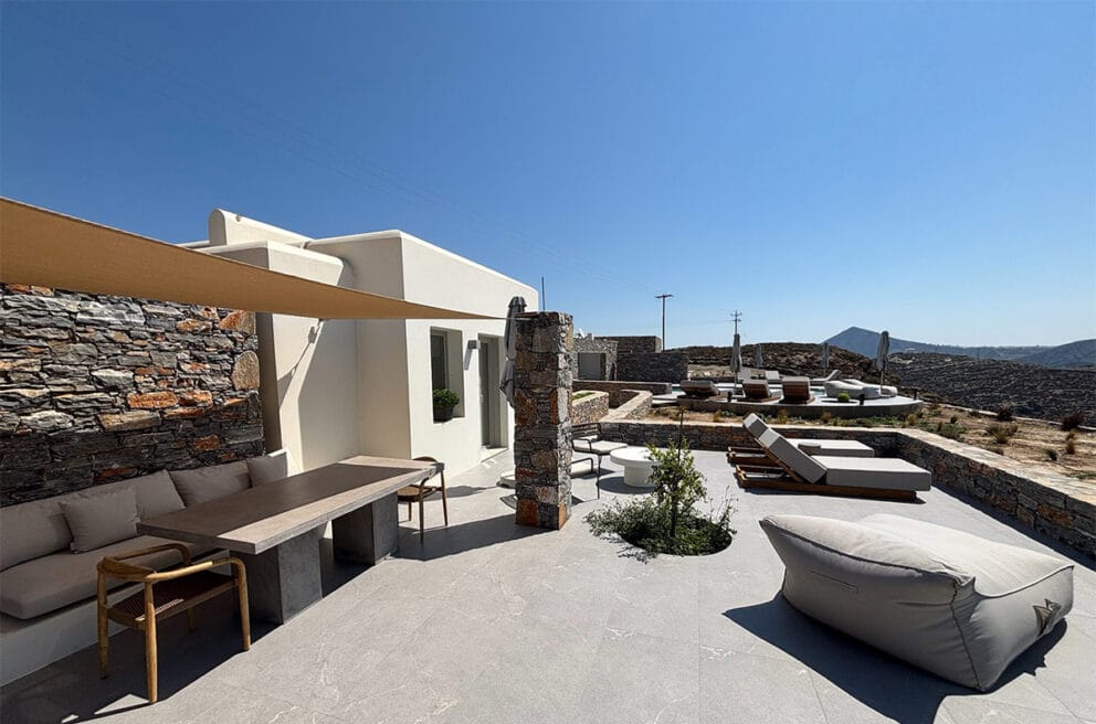 The architecture of each suite, with its clean lines and minimalist design, integrates effortlessly with the rugged, natural beauty of the surrounding landscape. Large windows and spacious terraces in every villa ensure that the breathtaking scenery is always a part of your experience, with two suites featuring private plunge pools and all guests enjoying access to our stunning infinity pool. Gazing out towards the distant lands of Crete, the views present a serene and expansive canvas of the Aegean Sea and the timeless tapestry of Greece.