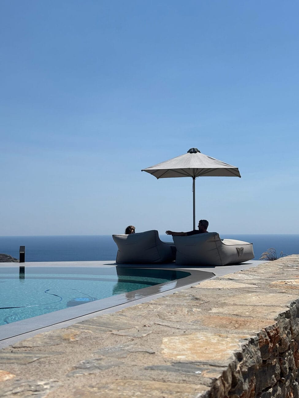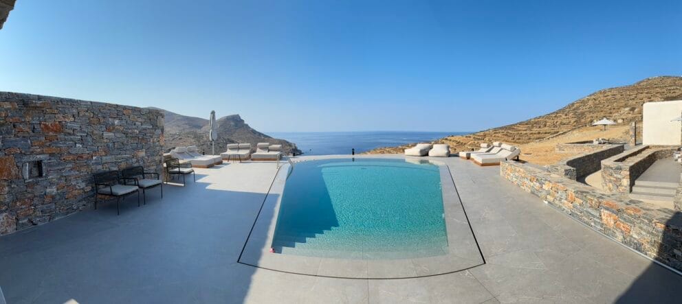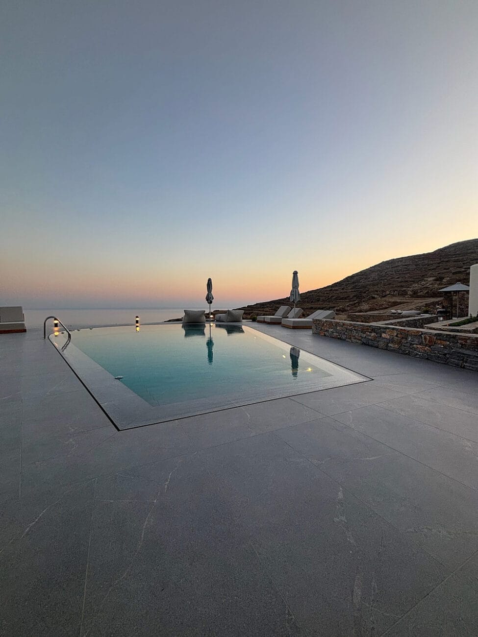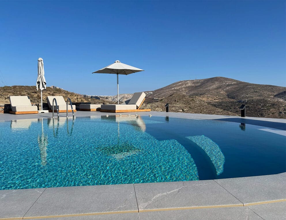 The architecture of each suite, with its clean lines and minimalist design, integrates effortlessly with the rugged, natural beauty of the surrounding landscape. Large windows and spacious terraces in every villa ensure that the breathtaking scenery is always a part of your experience, with two suites featuring private plunge pools and all guests enjoying access to our stunning infinity pool. Gazing out towards the distant lands of Crete, the views present a serene and expansive canvas of the Aegean Sea and the timeless tapestry of Greece.